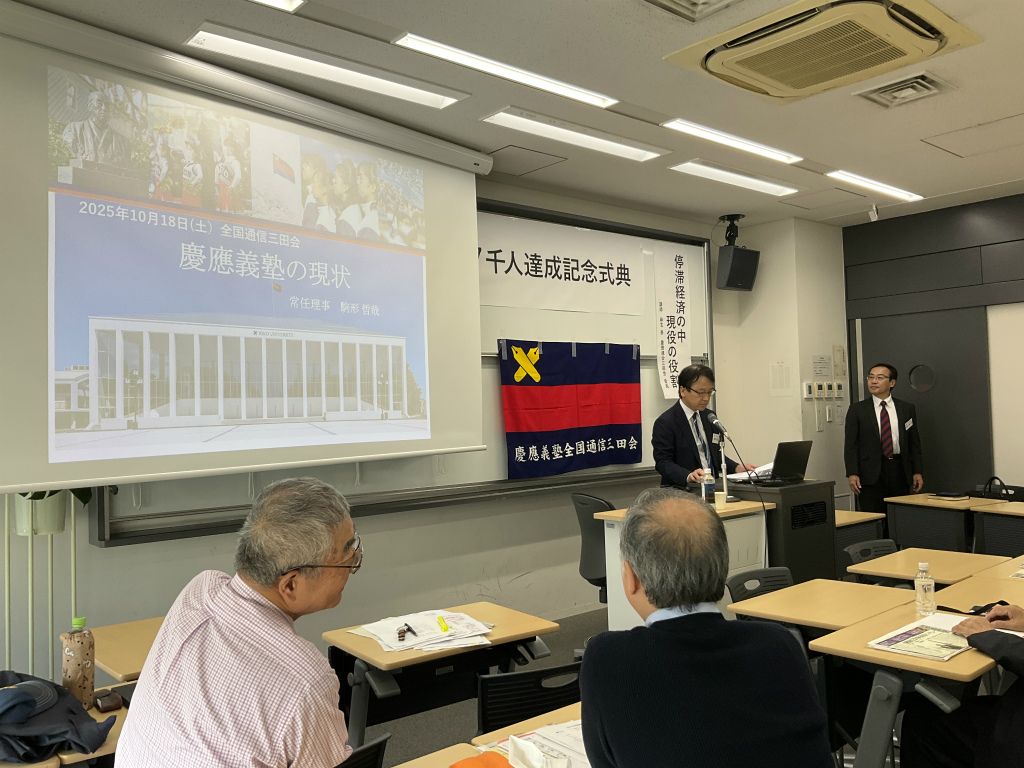 司会挨拶:吉浜副会長 ・吉浜副会長より、顧問3名の紹介、物故者1名の報告と黙祷 ・議長と書記の選出、司会一任により下記の通り選出 議長:堀田副会長、書記:小林総務部員 開会 1.会長挨拶:山岡会長(配布資料参照) ・通信卒業生17,000人の記念式典の件。 ・今年3月の卒業生では、2名へユニコン賞贈呈。 ・今年の春の幹事会を松本市で交流会という形で5月に開催した。来年の春は、大阪にて交流会を開催予定。 ・6月は、徳島通信三田会の50周年記念と合わせて、第26回中四国合同通信三田会が徳島市で開催。 ・7月は、札幌通信三田会の55周年記念式典が開催された。5年毎に式典をしている。 ・広報の星野部長により121号会報を発行。 ・9月は、拡大北関東3県の合同三田会が、横浜と鎌倉を散策する形で神奈川通信三田会により開催。 ・九州合同通信三田会長崎大会が開催。 2.各部報告 1) 企画部:出口部長 この後、連合三田会の麻生会長による講演、 卒業生17,000人達成記念式典を開催。 2) 会計監査:柴田会計監査 丸尾氏と、正確に処理されていることを確認。 3) 広報部:星野部長(資料参照)会報誌121号発行した。次号の122号が2月来年発行予定。 4) 渉外部:迫部長 (資料参照)。2025年9月卒業生の名簿は2月に届く予定。 5) 情報システム部:高橋豊副会長 HPを改定した。 6) 総務部:石川総務部長 ・人事について。出口企画部長が副会長、須賀総務副部長が企画部長へ就任。 新たな通信三田会会長4名が幹事へ就任。 ・2026年春の交流会を大阪で開催する際、交流会で挙がった議案等は、 次の役員会で諮らせてもらい確定させる。 ・2027年春の交流会開催地について、 8月末までの募集に対して、申し込みがなかった為、 今回是非ともとのお声があれば次回の役員会で諮らせてもらう。 7) 地域連絡部:瀬戸田副会長(資料参照)九州合同(長崎開催)、 中四国合同(徳島開催)通信三田会の開催日付訂正。 3.各地域三田会報告 ・東京:伊藤会長(資料参照)行事関連報告。 ・神奈川:竹原会長(資料参照)連合三田会集合場所について報告。 ・千葉:渡邉会長 (資料参照)行事:手賀沼散策の報告。 ・茨城:山岡会長 北関東合同3県の三田会開催報告。 ・群馬:田山会長 (資料参照)活動を充実させていく。 ・宮城:小野会長 松島にあるみちのく伊達政宗歴史館の見学の報告。 ・札幌:吉田会長 (資料参照)55周年記念式典開催の報告。 ・岩手:藤村会長 岩手通信三田会が発足。会員7名。実際活動しているのは5名。 ・静岡:長澤会長代理(資料参照)新年会と総会の報告。 ・山陰:松本事務局長(資料参照)復帰した三田会。年に二回の御飯会。現在7人。 ・広島:瀬戸田会長(資料参照)活動報告。 ・愛知:岩田会長 (資料参照)新入会員1名。2~3名増える予定。 ・長崎:堀田(敏)会長 九州合同通信三田会長崎大会の報告。栗生部長が長崎にお越しになった。 ・熊本:都留元会長 九州各県と連携して生き残っていく。10年・20年後を見据えて考える。 ・徳島:大原会長 (資料参照)50周年行事の報告。11年ぶりの開催。 ・大分:石津会長(資料参照)中津ツアーの報告。来年9月12~13日、九州合同三田会を中津で開催予定。 ・松本:矢澤会長代理 春の松本交流会の報告。 ・岡山:大森会長 (資料参照)中四国を岡山で開催する予定。 4.慶應義塾の近況報告:駒形哲哉常任理事 駒形哲哉常任理事により慶應義塾の近況について(20分)。 ・5月27日より第二次伊藤塾長体制 ・パリオリンピックでフェンシング、レスリングで塾生が活躍。 ・命あるものとの共生の活動 ・世界最前線の人を大学にお招きして講演をしていただく。 ・研究については、分野横断的に社会実装を目指す。 ・量子コンピューターと人工知能を組み合わせ、健康維持に関する体内のメカニズムを研究。世界トップレベルの研究。 ・生産性を上げるためにはAIを活用していく方向。 ・財務的には、半分は研究、半分は医療に使っている。 ・予防医療センターにて健康寿命を延ばす為の優れた医療サービスを目指す。 閉会 以上 (文責 2025/10/20 総務部 小林希依子 記)